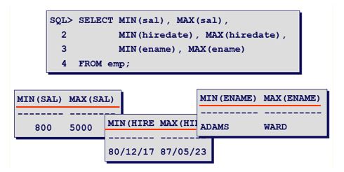 MIN(sal), MAX(sal) 은 최저 월급과 최고 월급을 나타내고, hiredate는 가장 오래된 입사일과 최근의 입사일을, Caracter type도 알파벳 순으로 최저 값과 최고 값을 나타내고 있다.