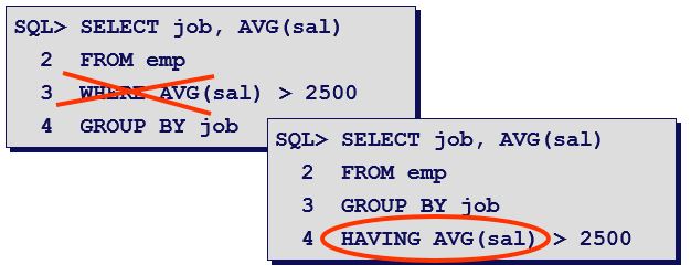 - WHERE 절에서 그룹 함수는 사용되어질 수 없고, HAVING 절을 이용해 조건을 부여
